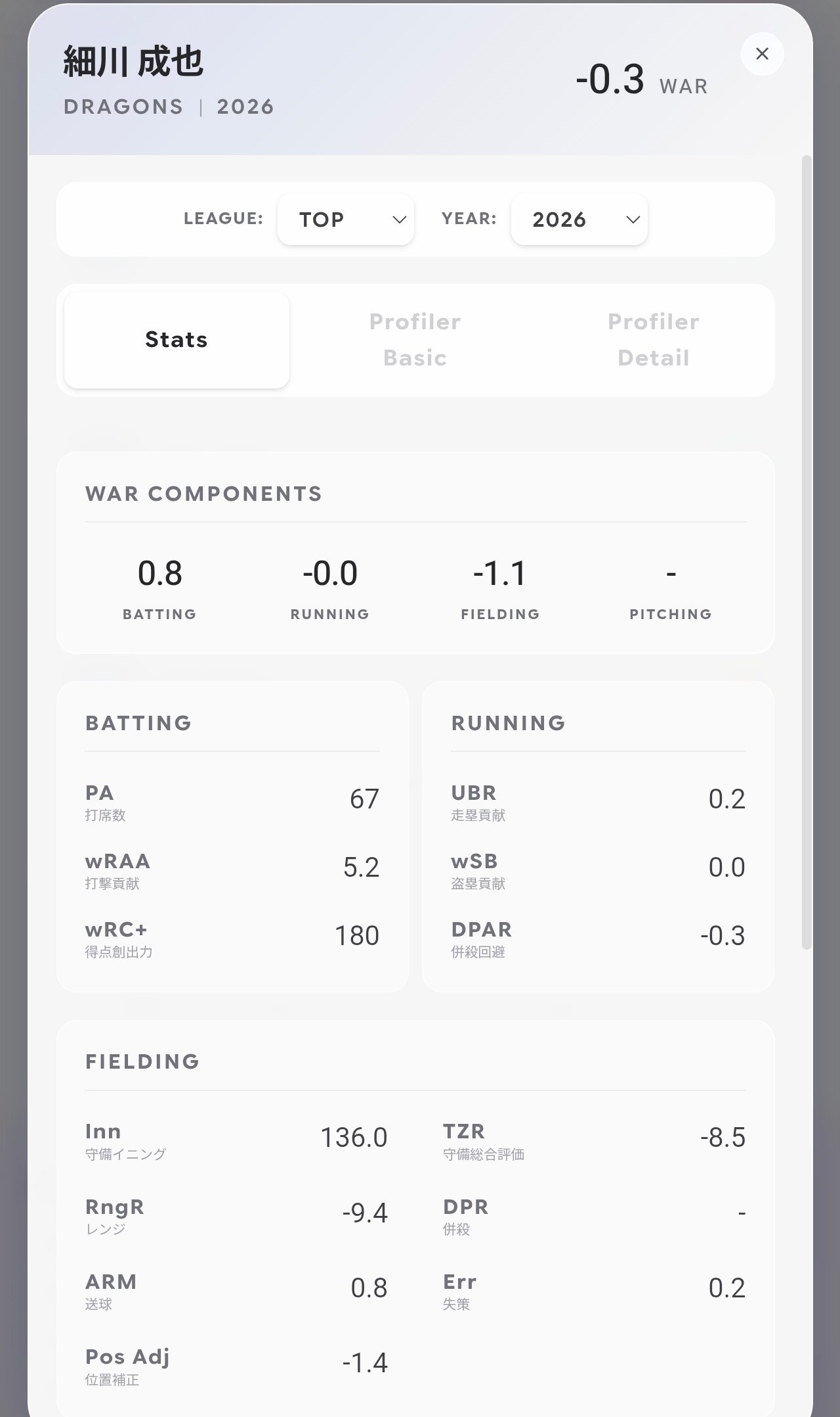 現在、OPS.900、wRC+180という、球界屈指の圧倒的な打撃成績をマークしている細川選手。しかし、驚くべきことに総合指標のWAR(Wins Above Replacement)がまさかのマイナス評価に……。