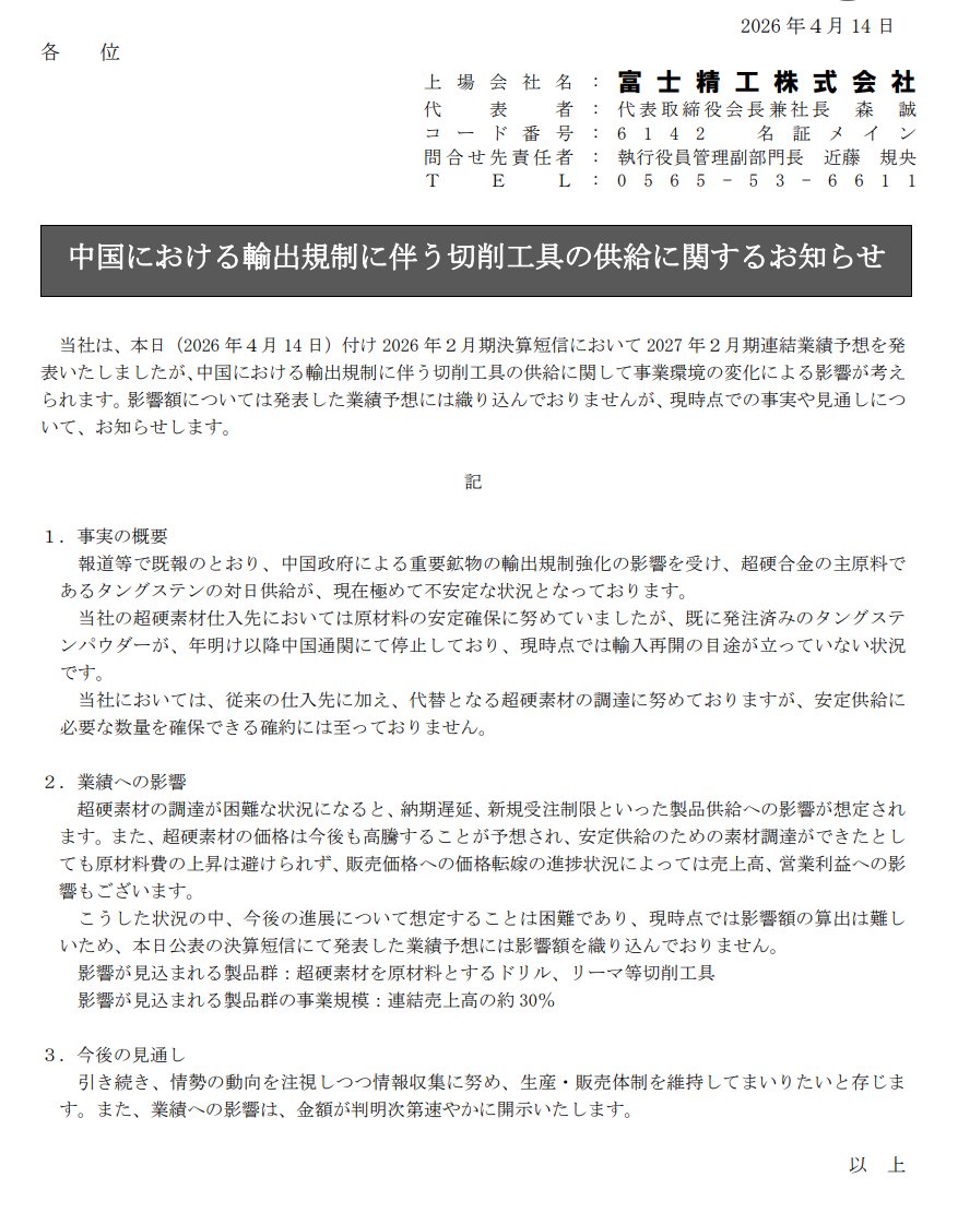 タングステンだってそうやし加工に使う油(油にも色々種類がある)だって手に入らんやろうしなもう現場では隠せない所まで来てるんやね