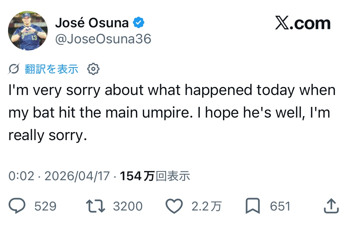 打者オスナ選手のバットがスイング後にすっぽ抜け、球審を務めていた川上拓斗審判員の左側頭部を直撃。NPBの発表によると、緊急搬送後に手術が行われ、現在は集中治療室(ICU)で治療中とのことです。スレ内では、衝撃の瞬間を捉えた映像に悲鳴が上がるとともに、以前から指摘されていたオスナ選手の「すっぽ抜け癖」を放置していた球団への批判が噴出。さらにヤクルト球団が公開した声明文の「日本語」や「不適切な一言」についても火に油を注ぐ形となっています。初の1軍主審という晴れ舞台で起きたあまりに悲しい事故。ロボット審判導入の是非を含め、野球界全体が揺れています。